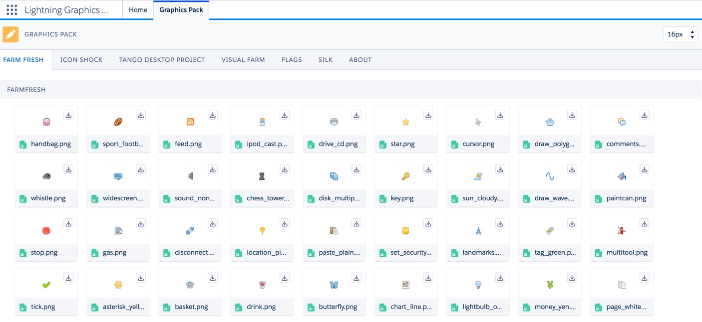 The Graphics Pack offers a versatile collection of images and icons, specifically designed to enhance Salesforce applications. This comprehensive set includes hundreds of graphics available in both 16×16 and 32×32 pixel sizes, suitable for tabs, image formulas, and Visualforce pages.